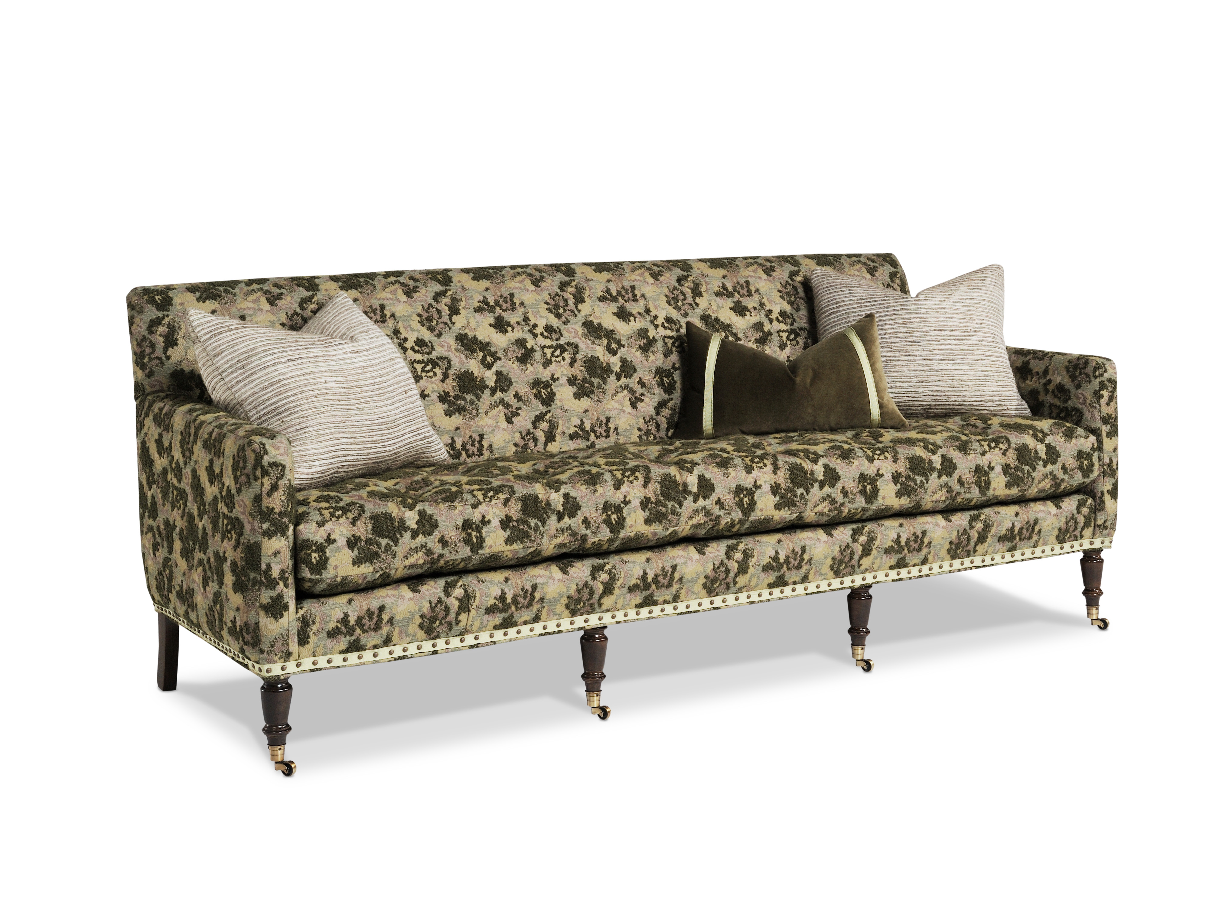 Options shown: Contrasting fabric on pillows / Added tape along base / 1/2" Truscan nails spaced 1/2" apart on tape