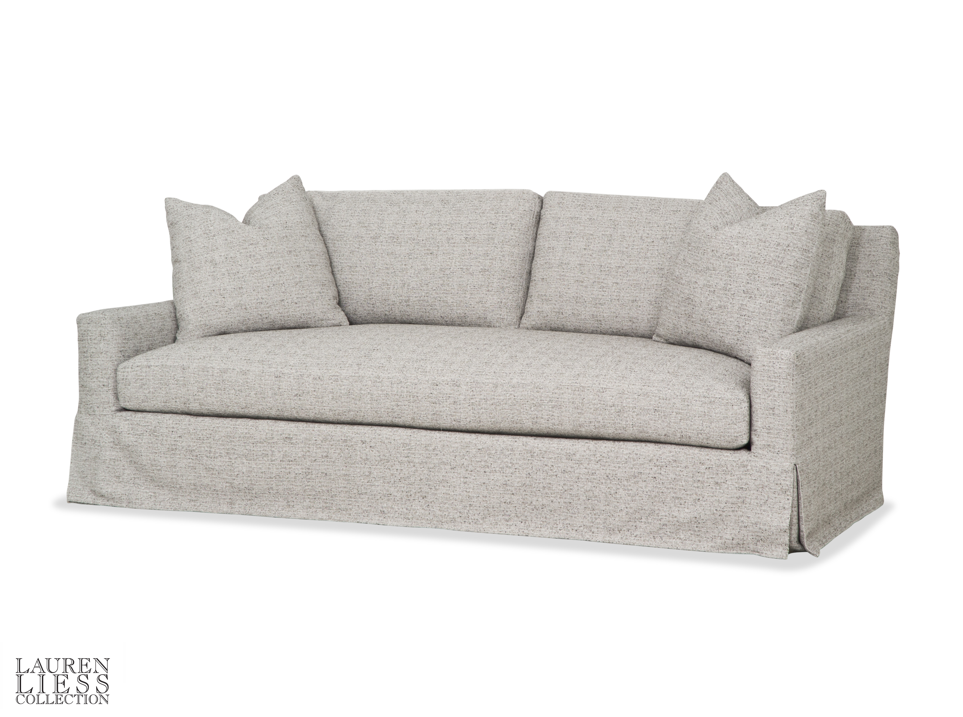 Loose back cushions/ 10/90 Down Filling standard in back cushions /(2)21" Throw Pillows / Upholstered base /Slipcover kisses the floor and is sewn with double needle stitching.