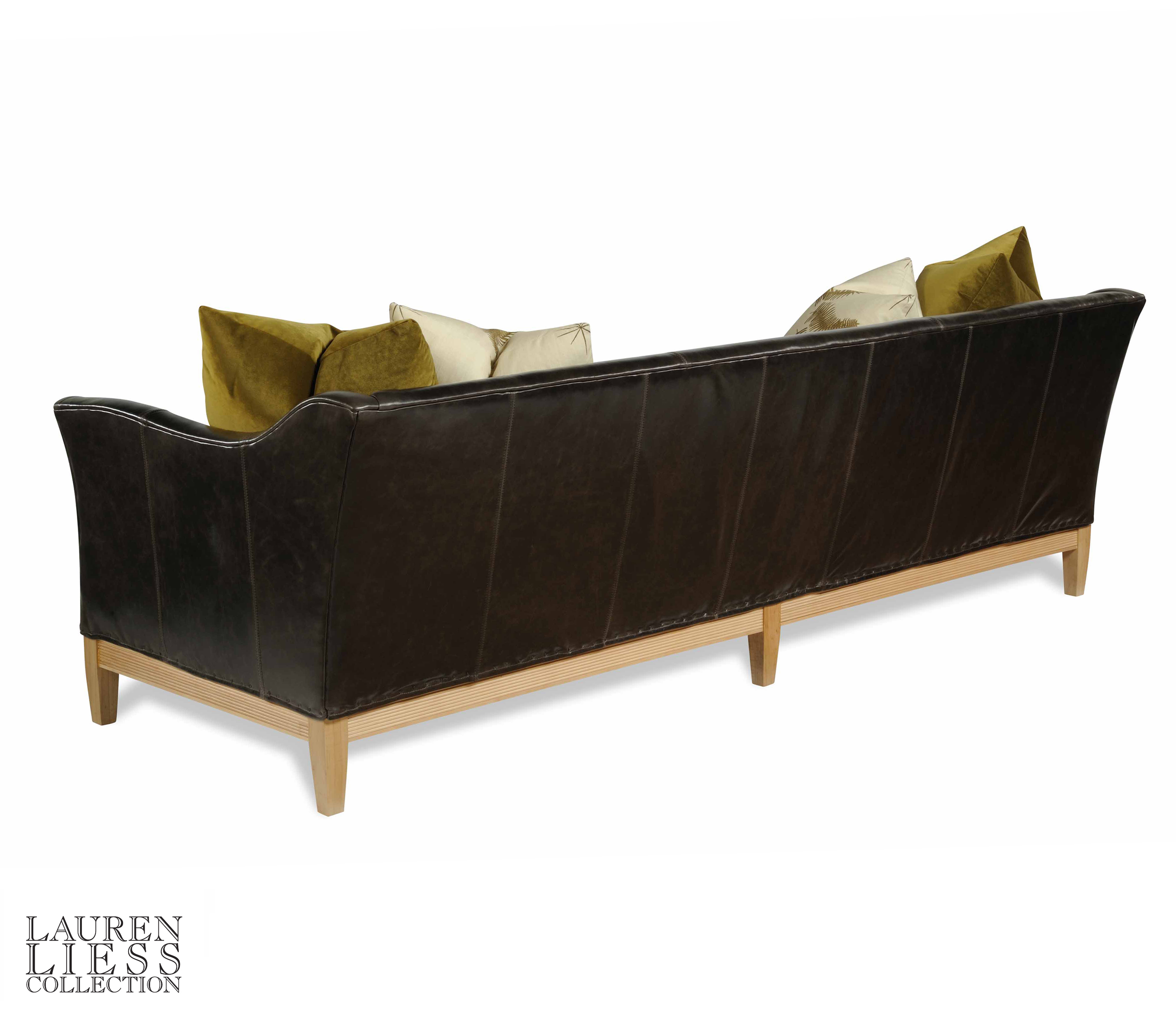 Tight back/(2)19"Throw Pillows/(2)21"Throw Pillows/Carpenter Tacks /Baseball stitching /Exposed wood base and legs.
