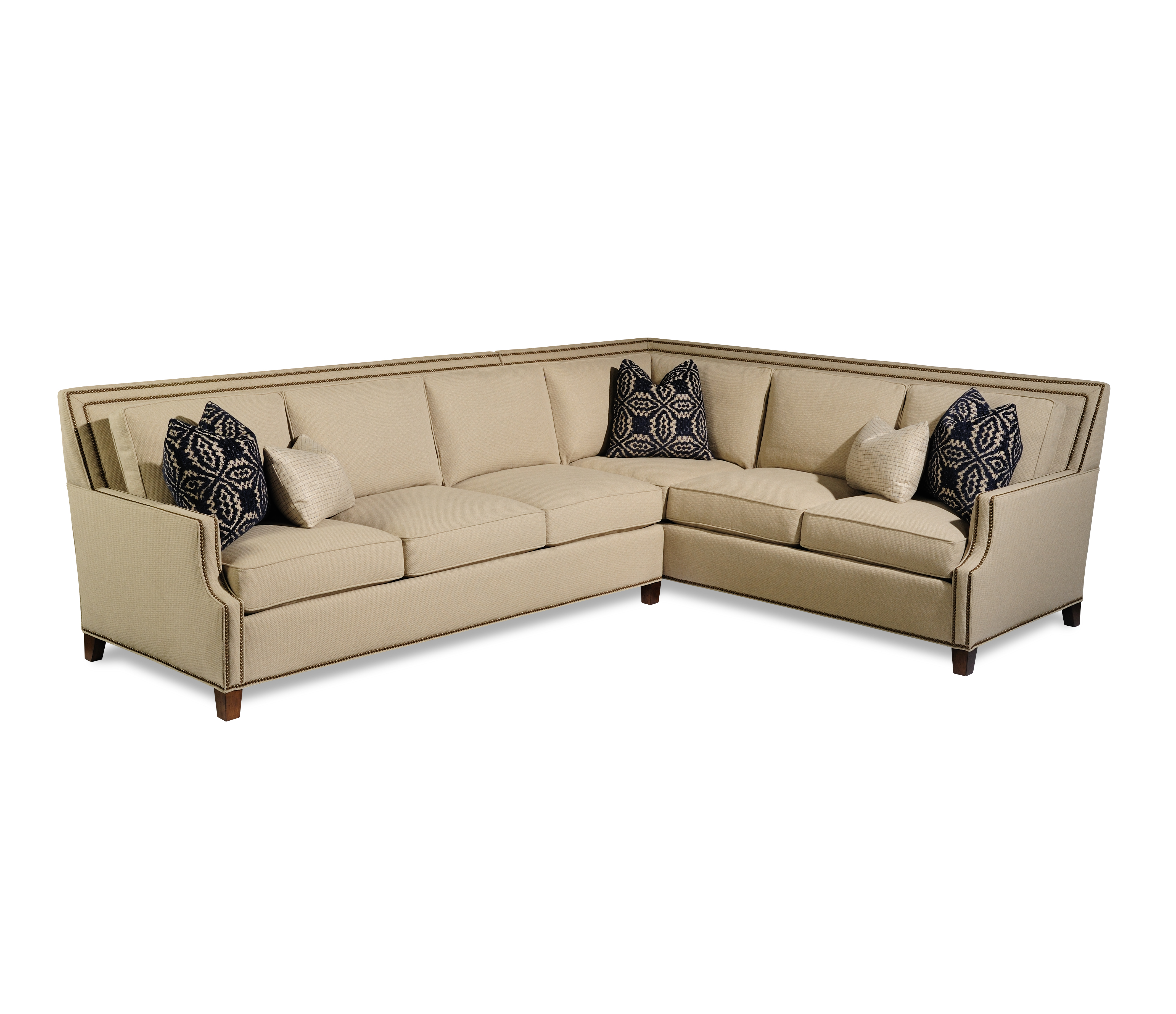 Contrasting fabric on throw pillows, 1/2" Natural Brass nails,