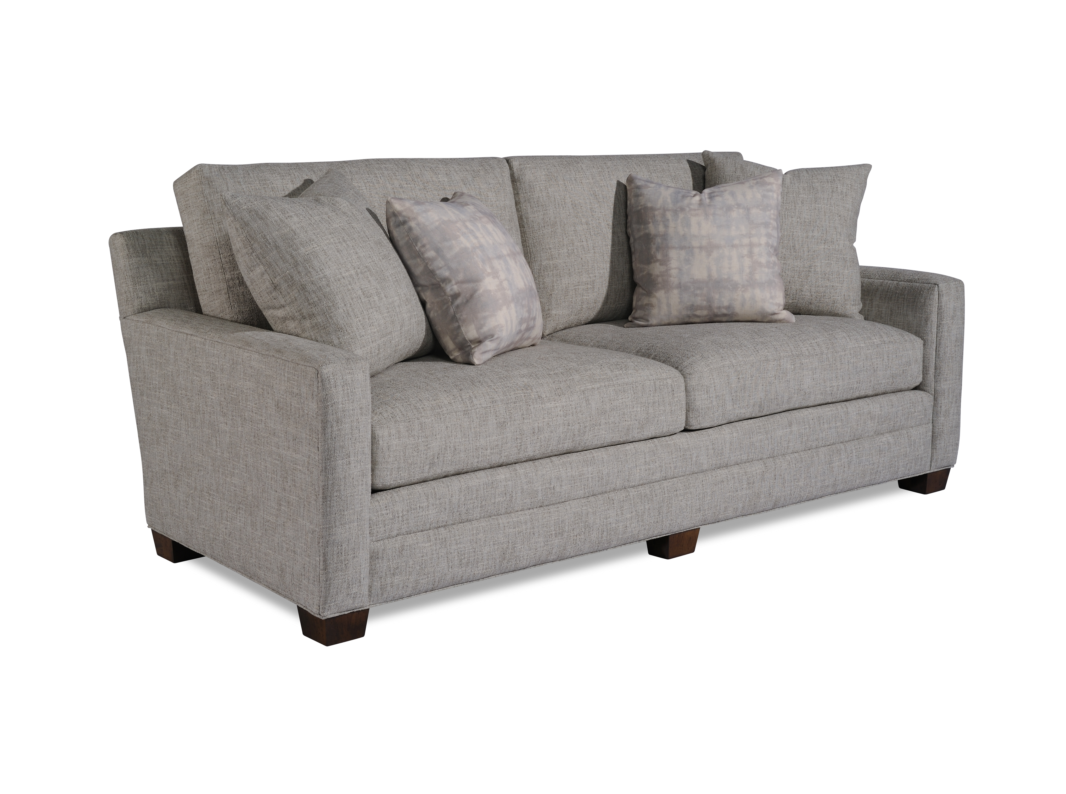 Plush Depth / Box Border Back cushion / Track arm w/Square Seat Cushion / Upholstered Base with California tapered leg / (2)19" Throw Pillows / (2)21" Throw Pillows
